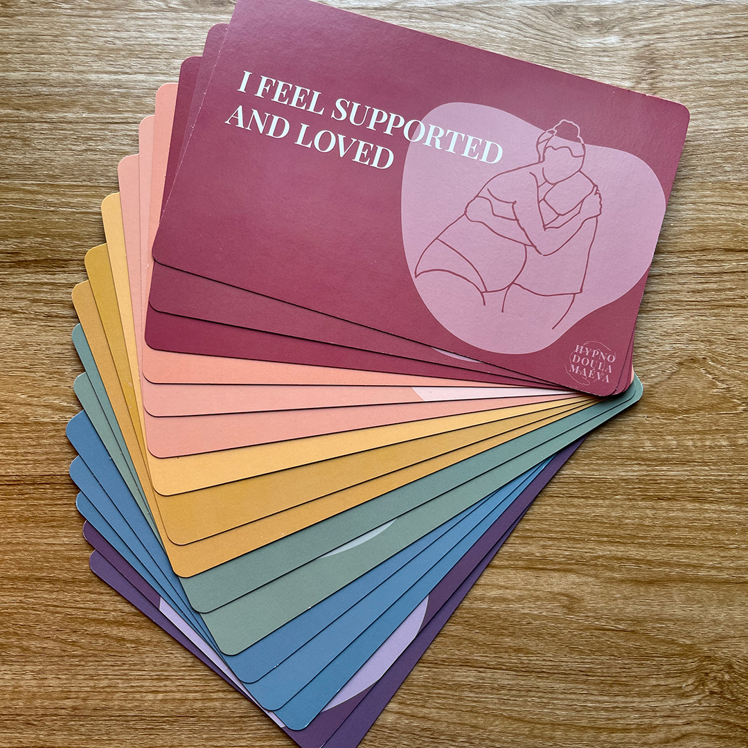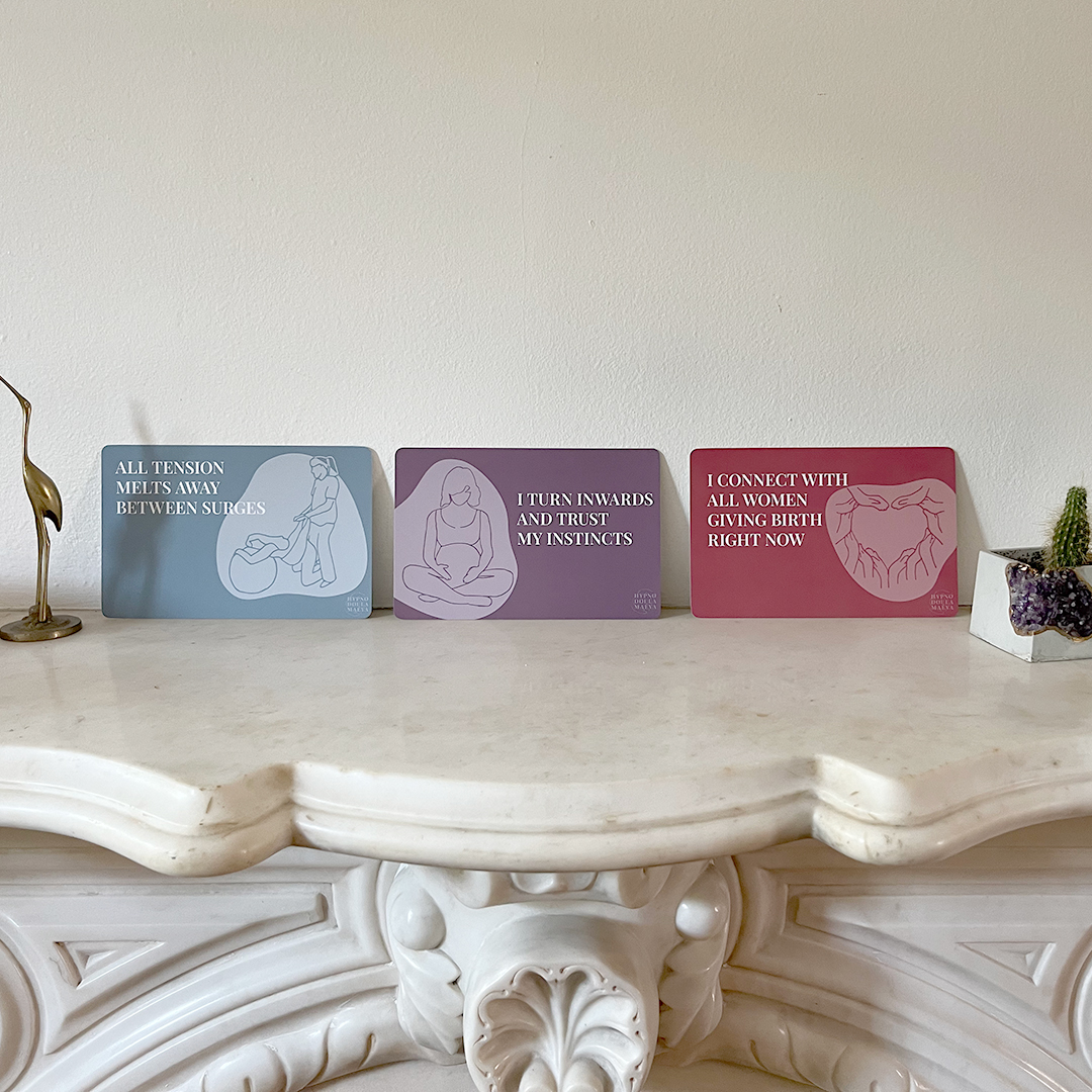 Based on Mindfulness, Hypnosis and the Mind Body Connection, Hypno Doula Maeva has designed a soothing collection of 16 affirmation cards to provide effective visual support in the lead-up to and during labor.